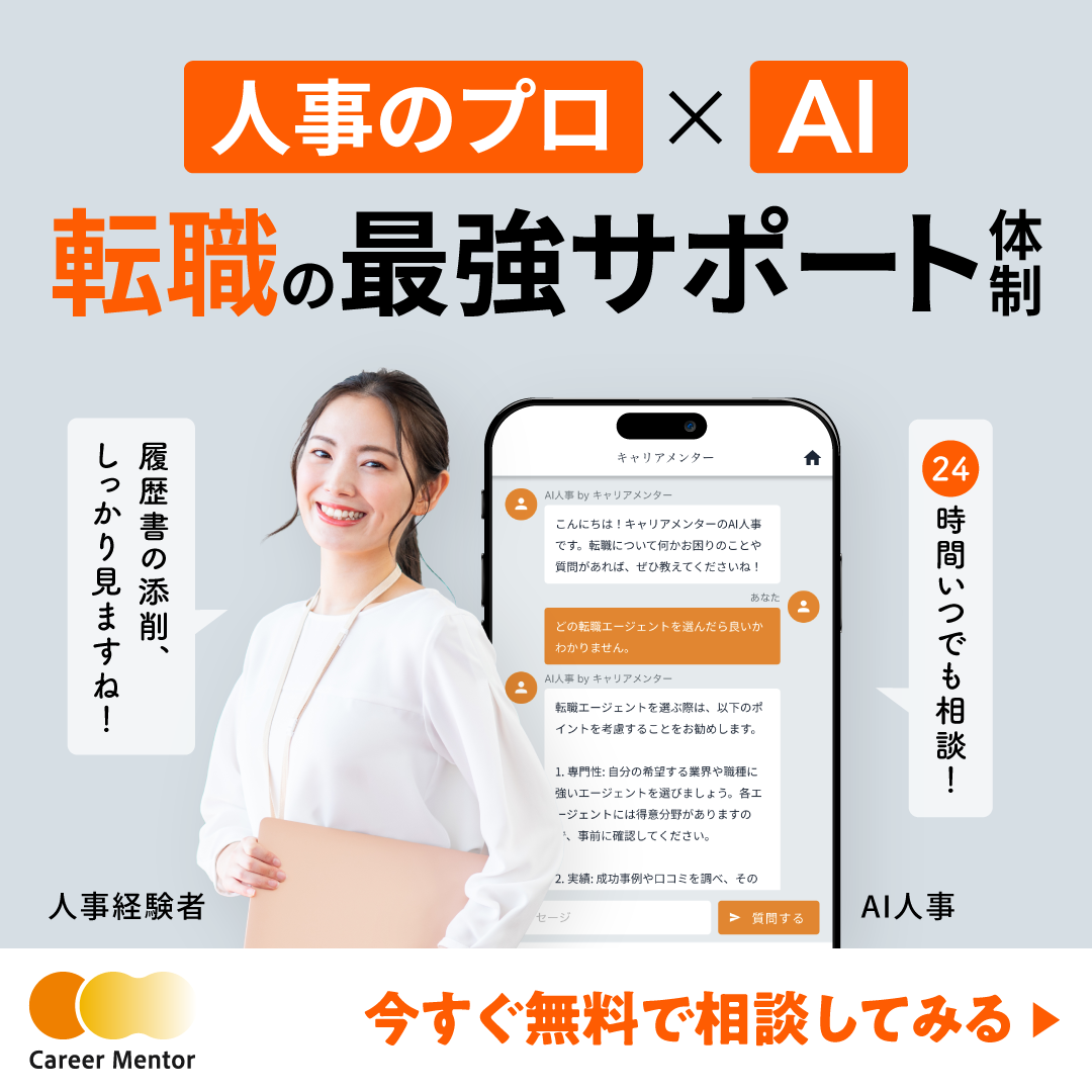 ただし、企業に聞きづらい内容も多いのが現実です。そんなときは、人事経験者が伴走してくれるCareer Mentorが最も安全な相談先になります。